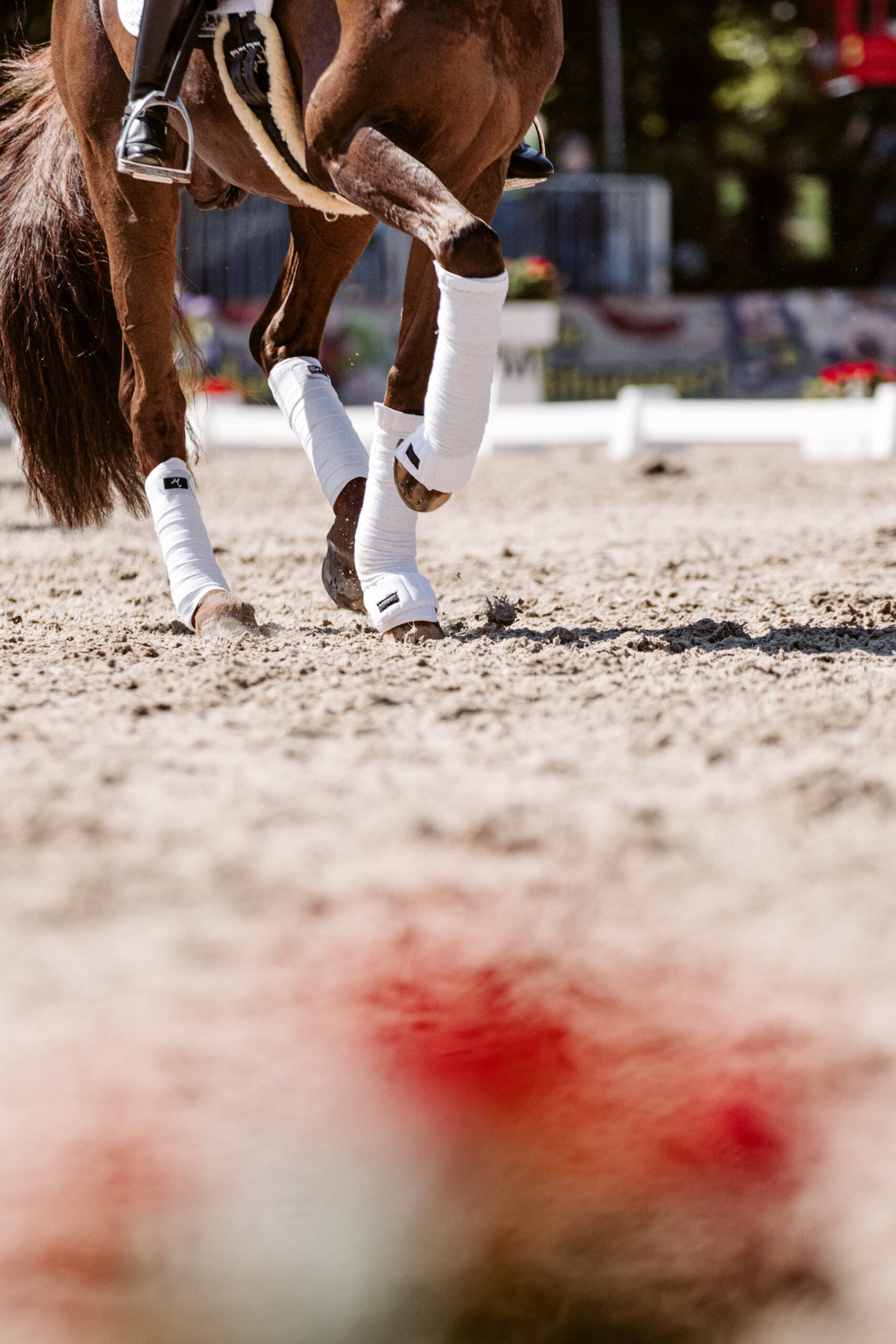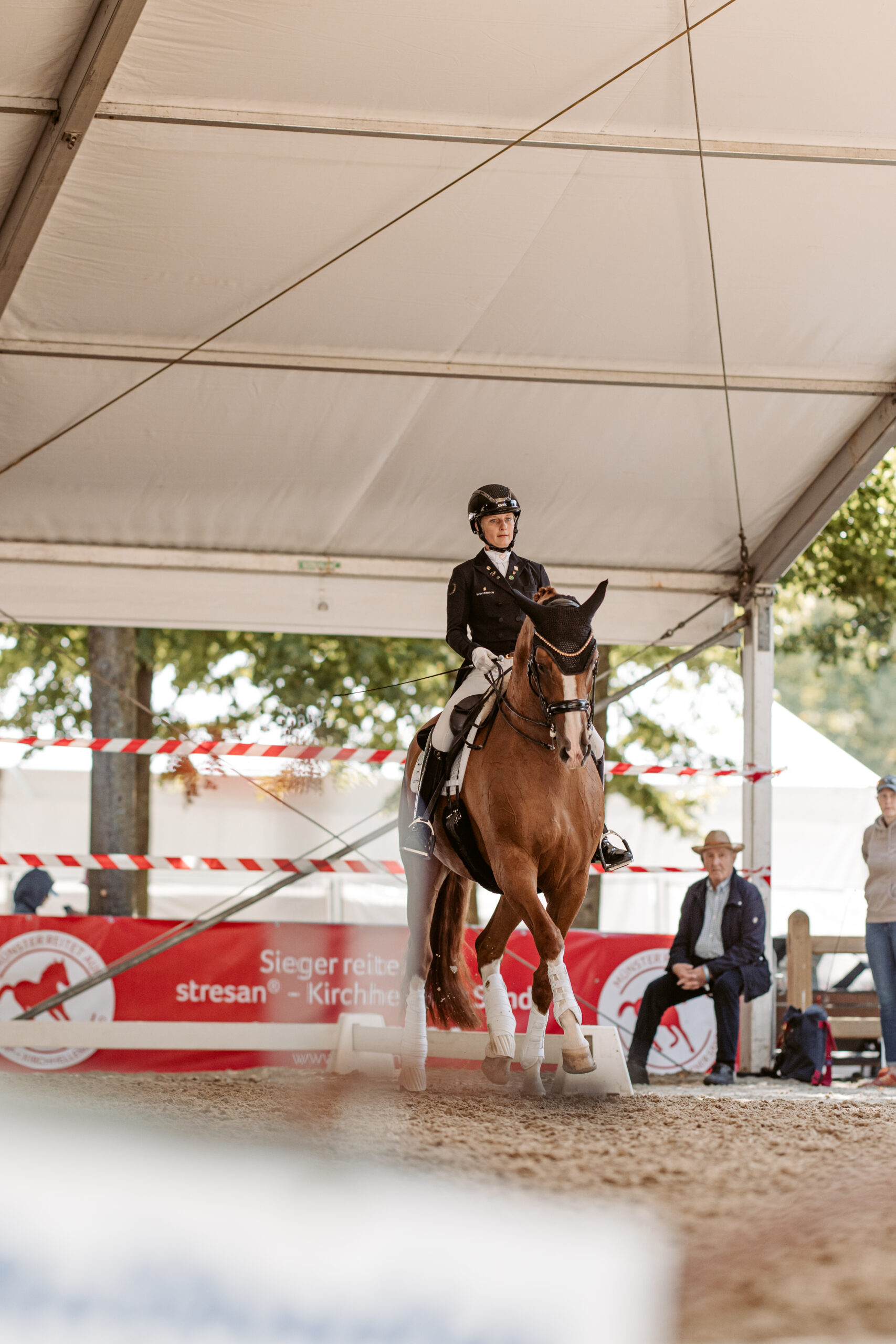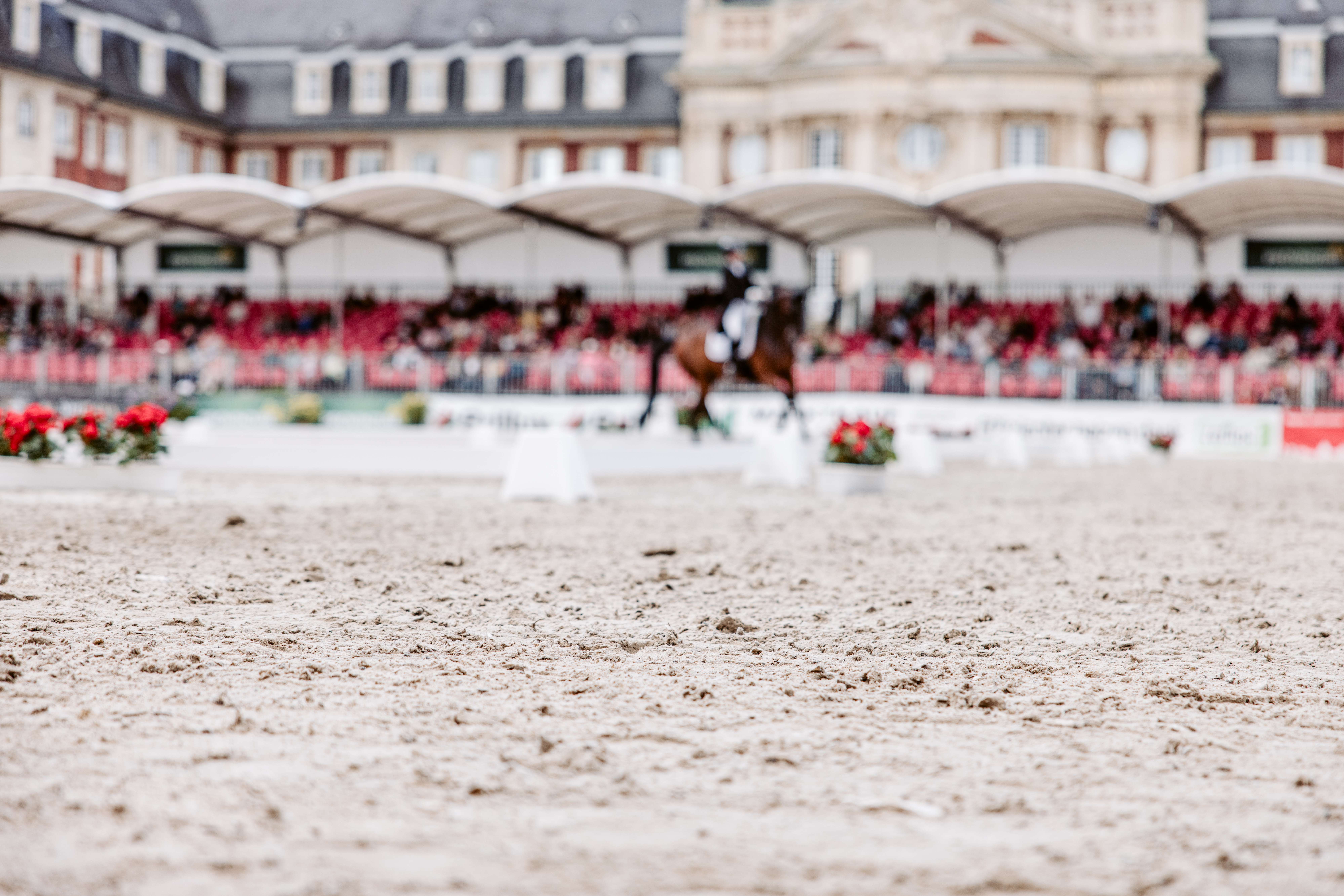 Voor het evenement zijn het hoofdrijterrein en het losrijterrein opgebouwd met onze speciaal afgestemde stresan® V toplaag – belastbaar, weerbestendig en turnierproef. Het voordeel van dit speciale mengsel is de snelle belastbaarheid van de rijbodem. Vooral bij evenementen en tijdelijke rijbodems is het belangrijk dat de bodem kort na het aanbrengen standvastig is.